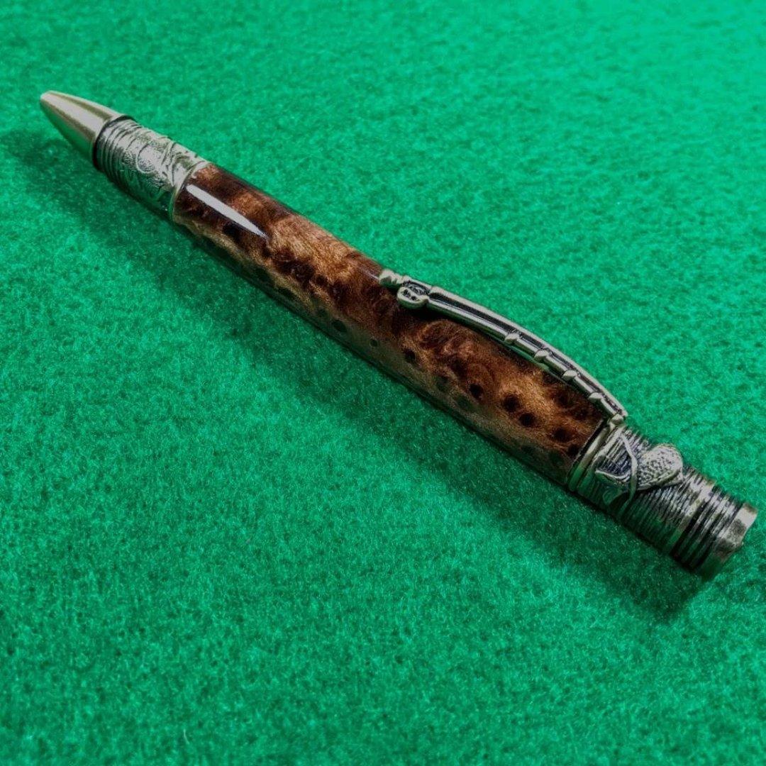 This exceptional exhibition grade African Pomelle Sapele. Common uses for this high-end material are guitars, ukuleles, in this case a beautiful Fly Fish Pen.