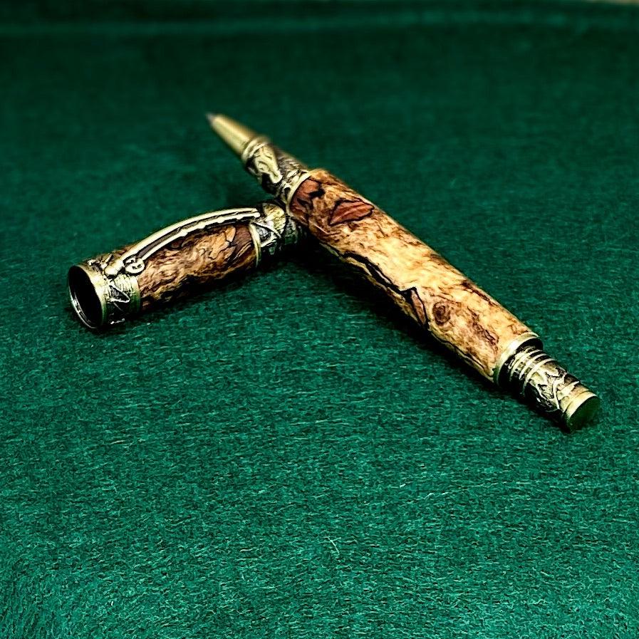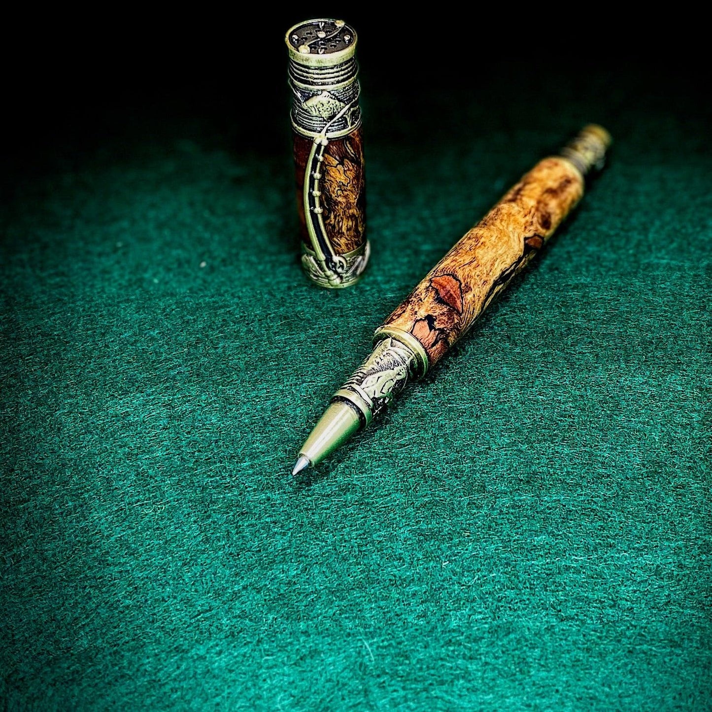 The Fish On! Fly Fish Pen takes the sport of fly fishing right into your office. It features a fly rod pen clip in an antique brass finish, which aligns with the fly line reeling in a fish. The pen tip features the quiet scene of a day on the river.