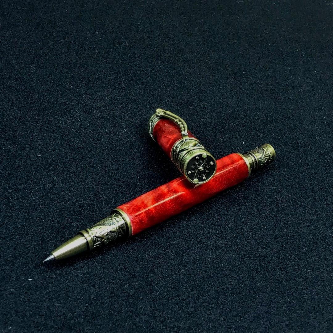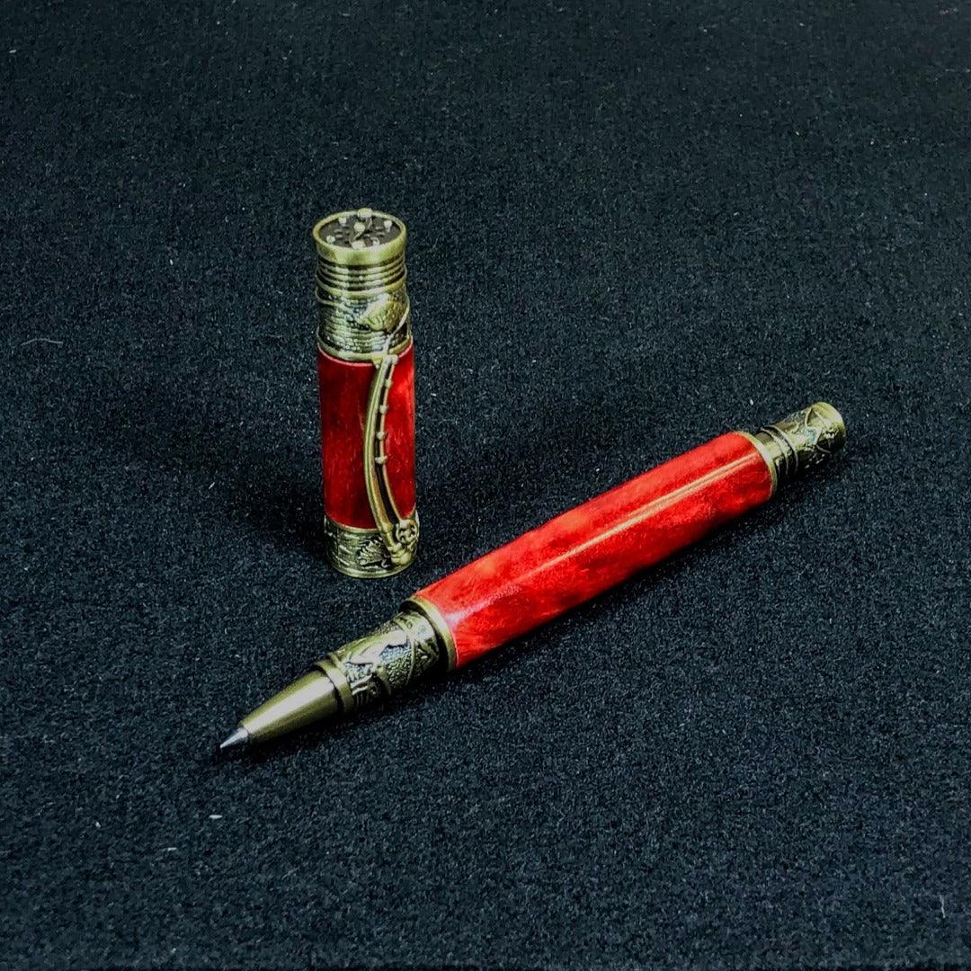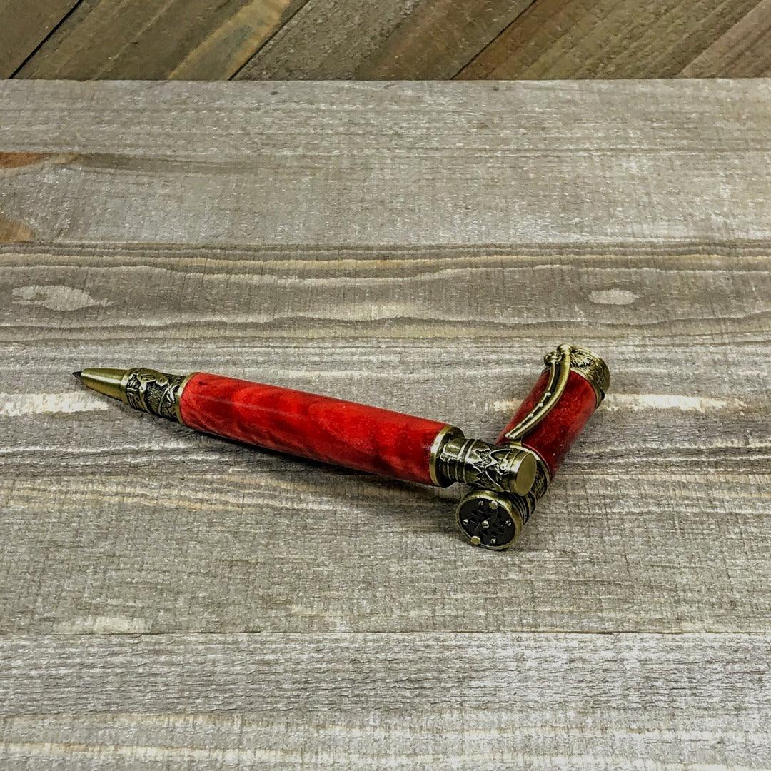 The Fish On! Fly Fish Pen takes the sport of fly fishing right into your office. It features a fly rod pen clip in an antique brass finish, which aligns with the fly line reeling in a fish. The pen tip features the quiet scene of a day on the river.