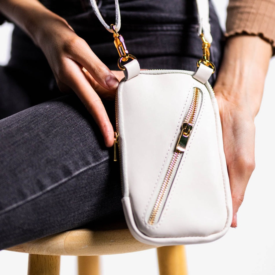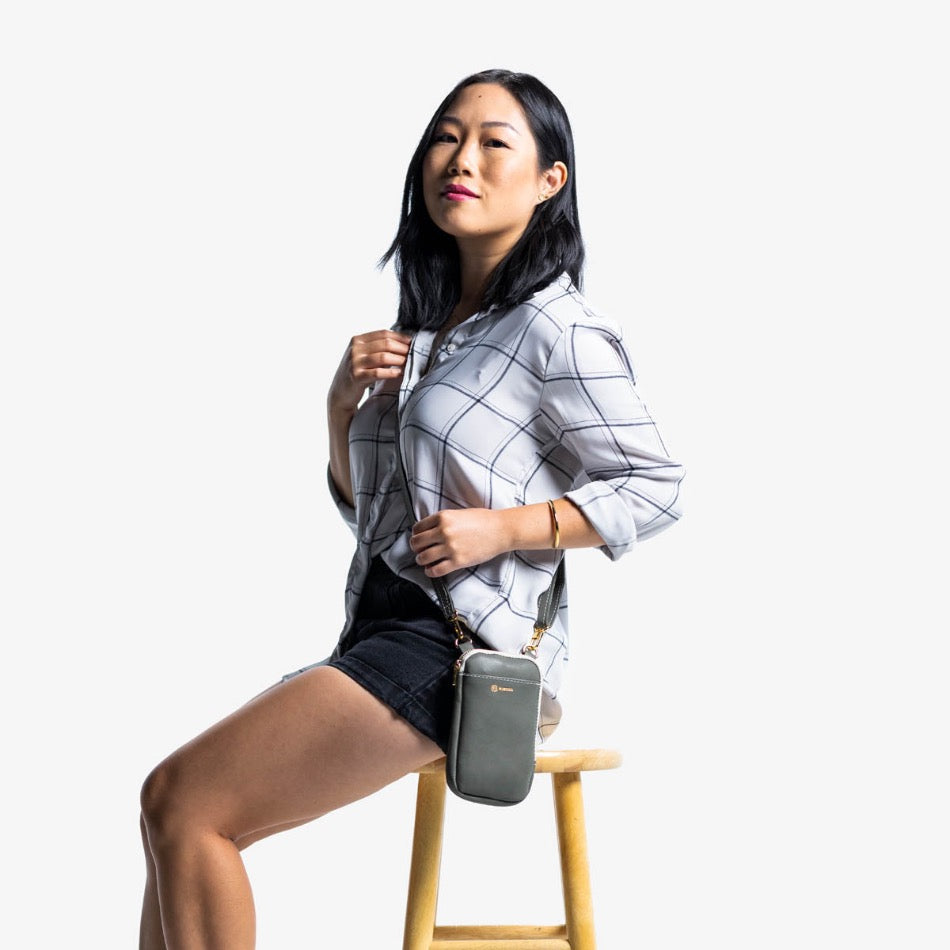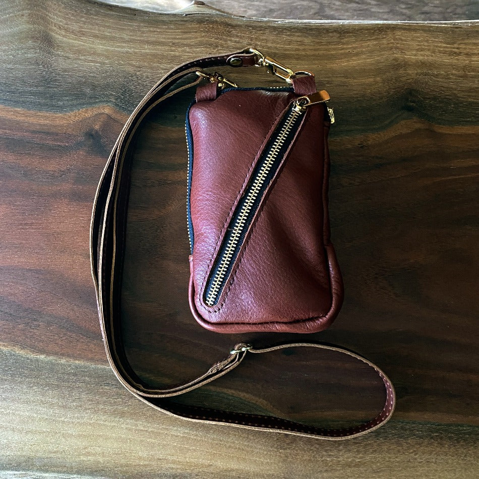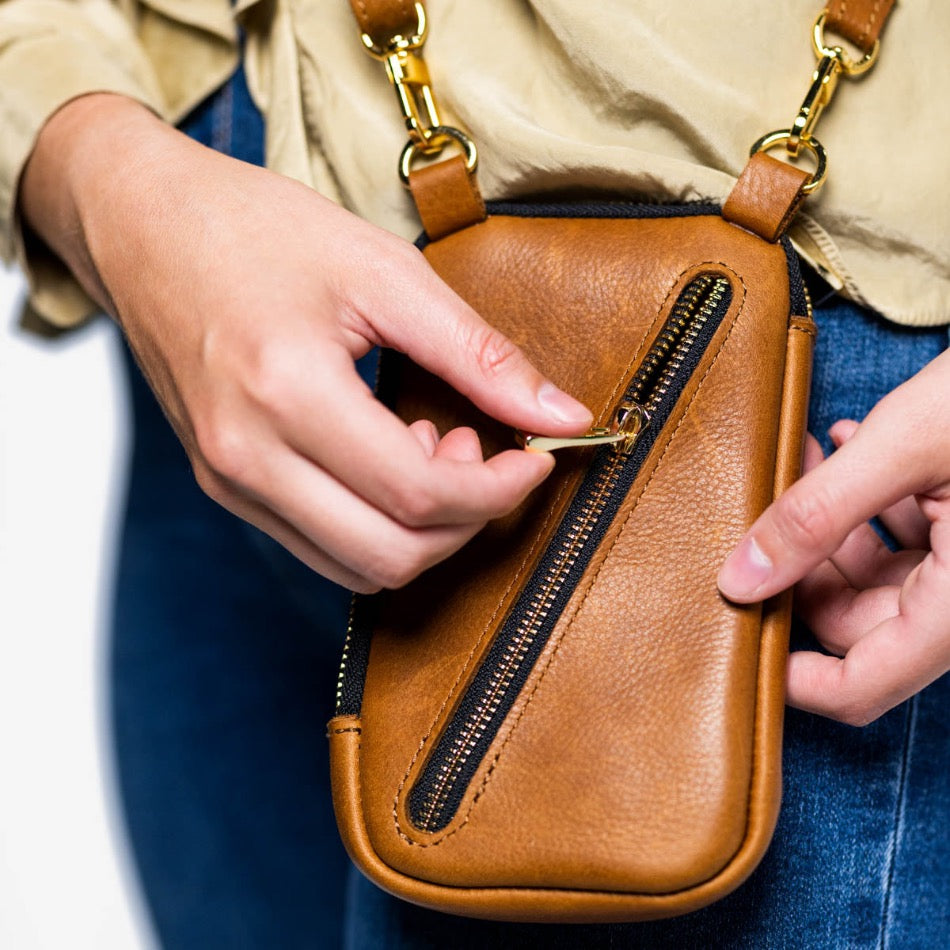 This small leather crossbody bag provides a total dimension of 4.5” x 7.5” while the adjustable strap spans 31”-58.” It has a 0.625” wide strap, exterior pocket, diagonal zippered pocket, and the capacity to hold any sized phone.