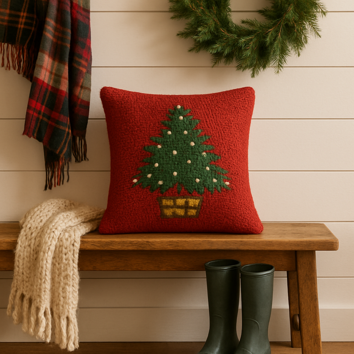 Festive Christmas Tree in a Bucket Hand-Hooked Wool Pillow - 18x18 Holiday Decor