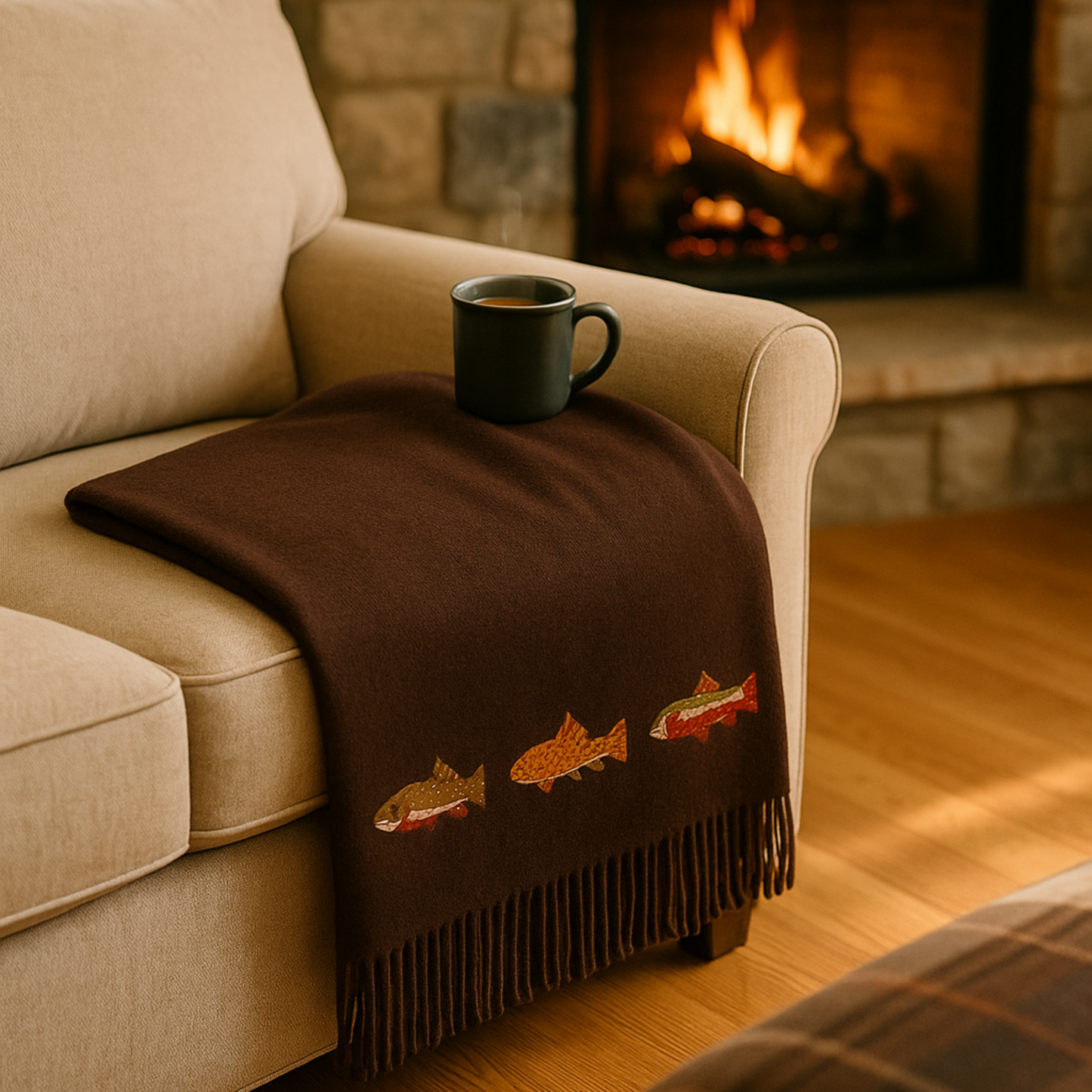 Transform your living space into a rustic retreat with this stunning wool-blend throw blanket featuring beautiful trout embroidery. Crafted by renowned artisans at Chandler 4 Corners, this isn't just a blanket—it's a statement piece that brings the tranquility of nature indoors.