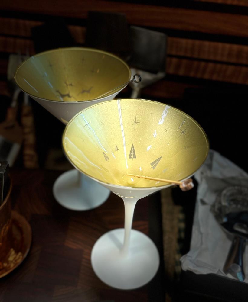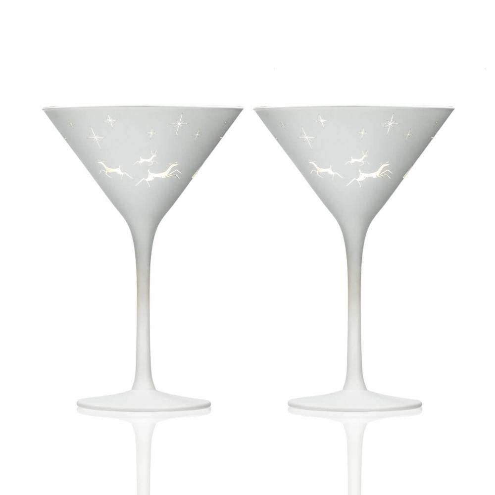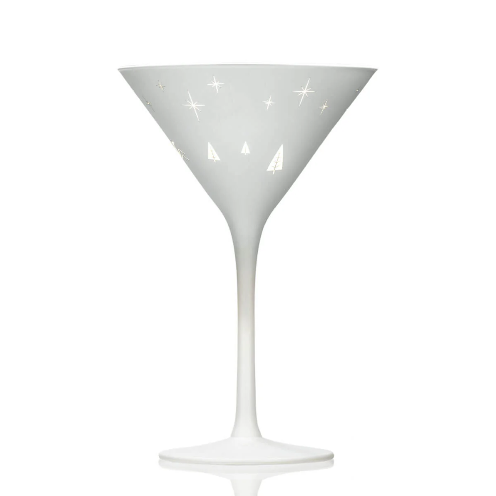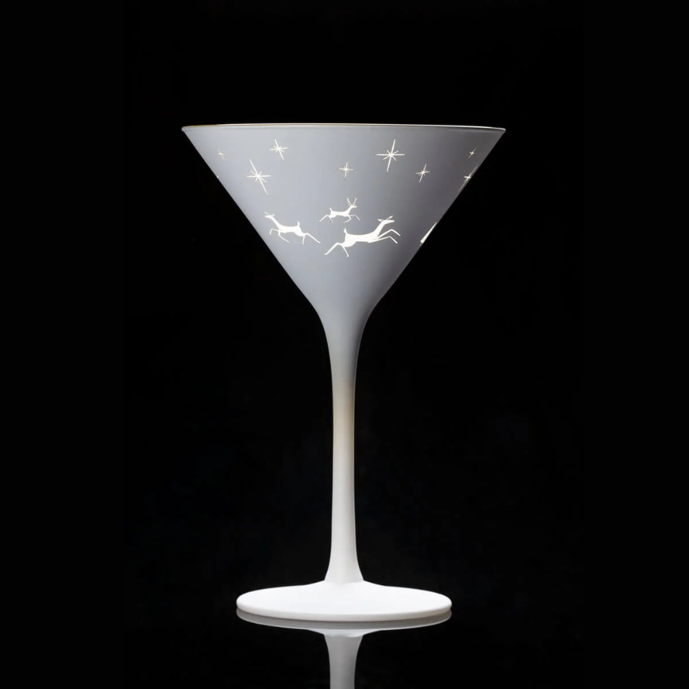 Step into Wonderland with this stunning mid-century painted glass martini. Each piece features a sheer-rim silhouette, artfully hand-painted in soft white and radiant gold. Delicate stars, evergreen trees, and three enchanted deer dance across the surface, revealing a luminous golden interior when caught in the light.