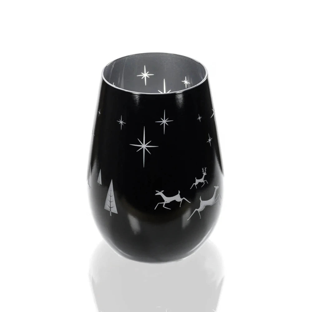 Discover "Wonderland" in this sleek Mid-Century wine tumbler. The rim is beautifully adorned with black and silver stars, evergreen trees, and three enchanted deer engravings. Each element is carefully placed to reveal the shining silver underneath. The glossy black and silver paint is fired onto the glass for durability and long-lasting color, even after being washed in the dishwasher. Whether used for wine, cocktails, or as a votive, this 16.5oz lead-free tumbler will bring holiday joy to your loved ones.