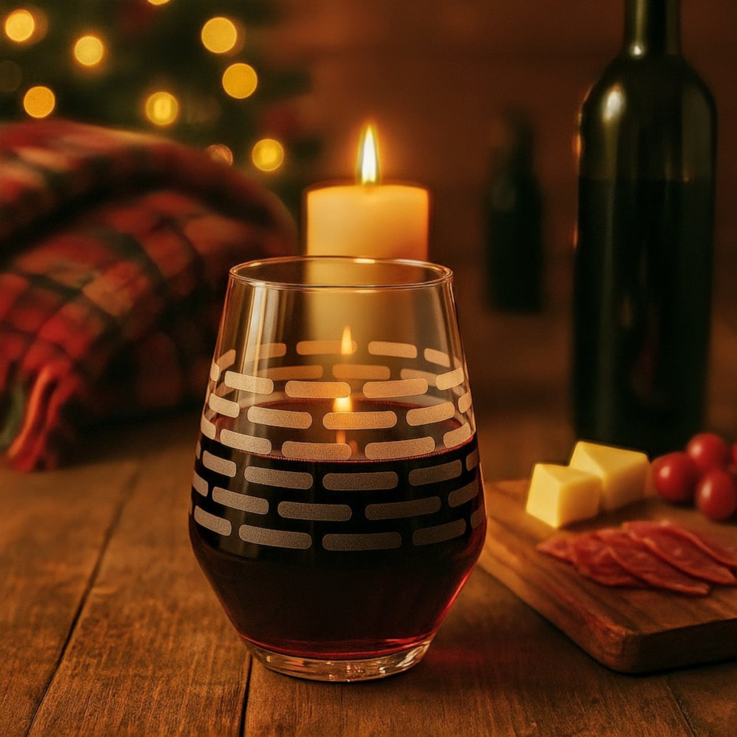 Wine glass with red wine on a wooden table with a candle and food items in the background.