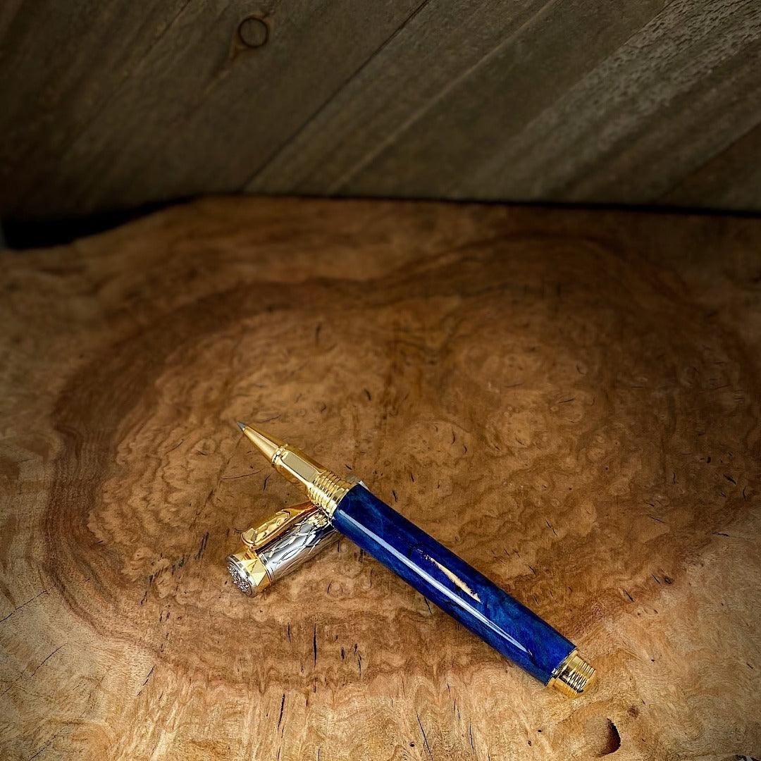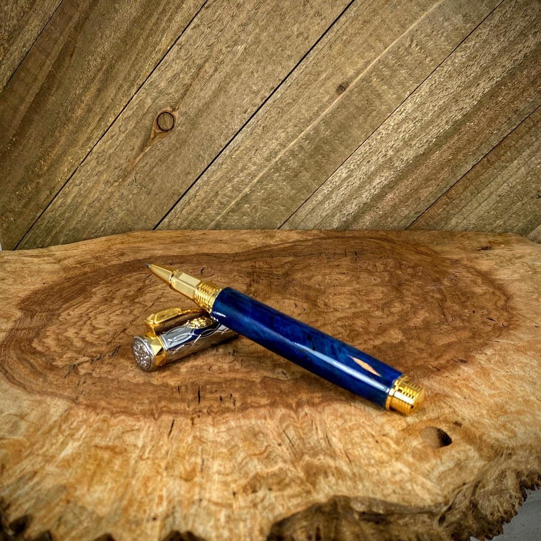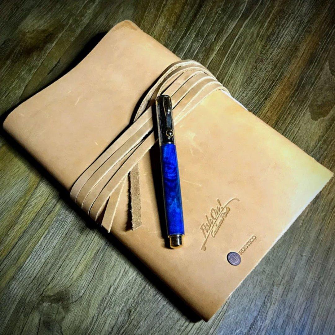 Our pen is crafted with box elder burl, dyed blue and photographed with our Messenger Leather Journal.