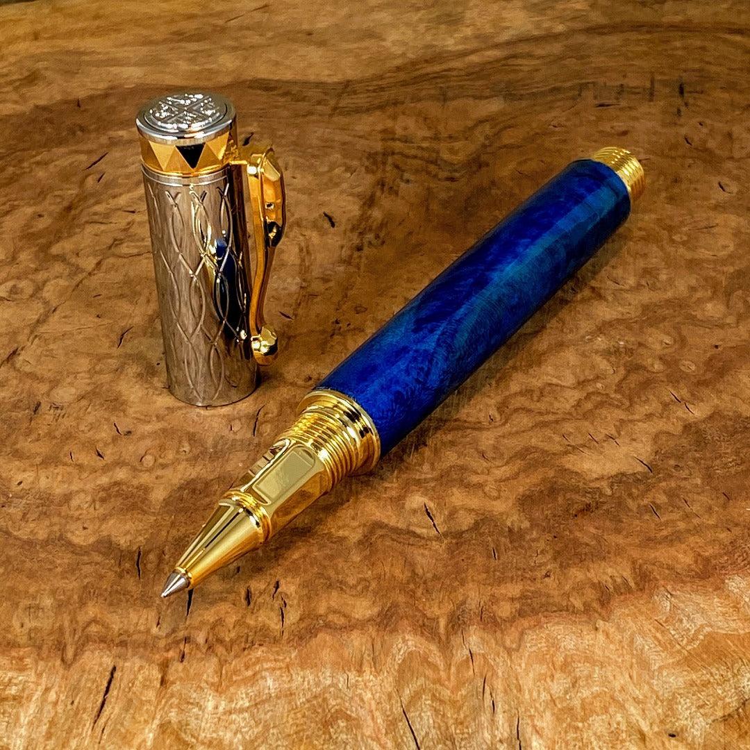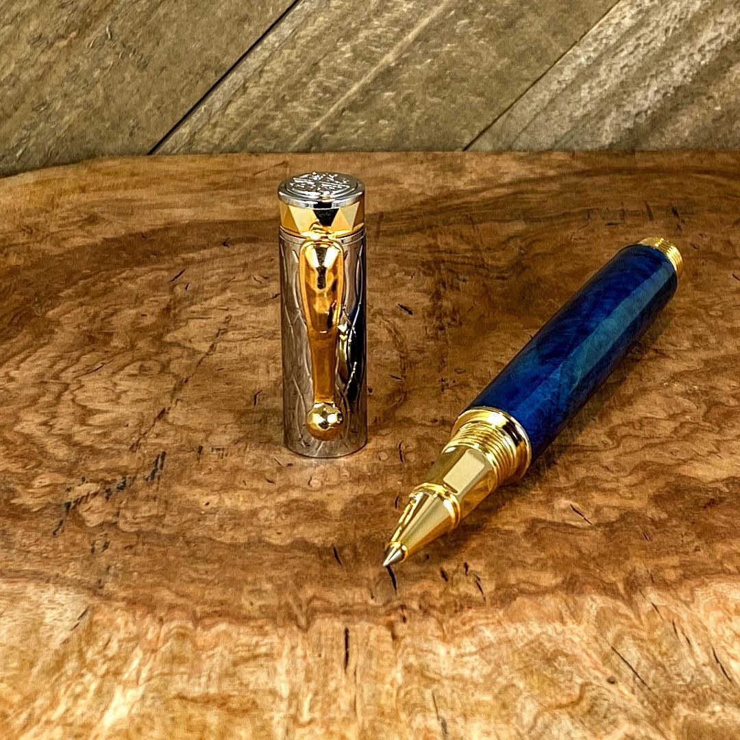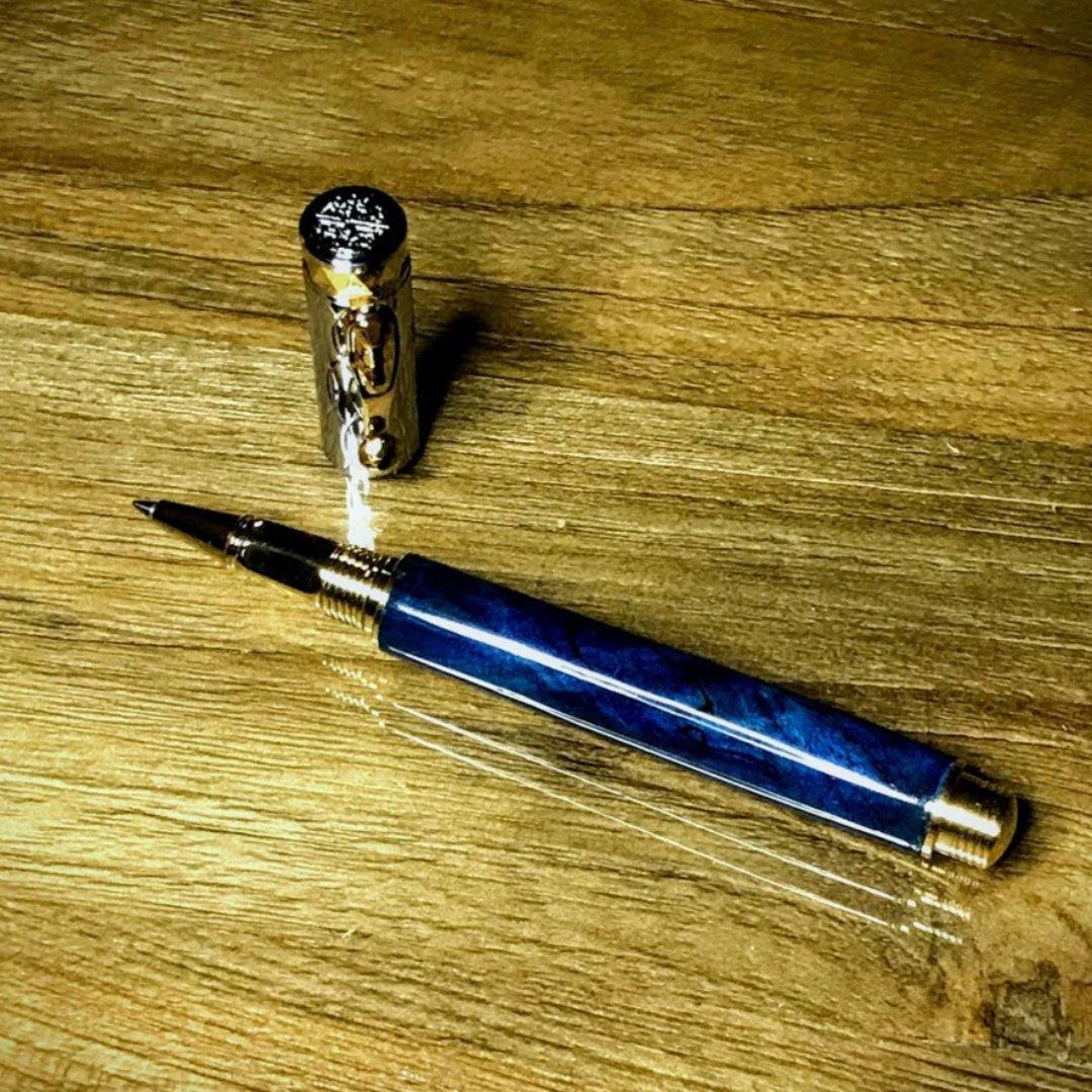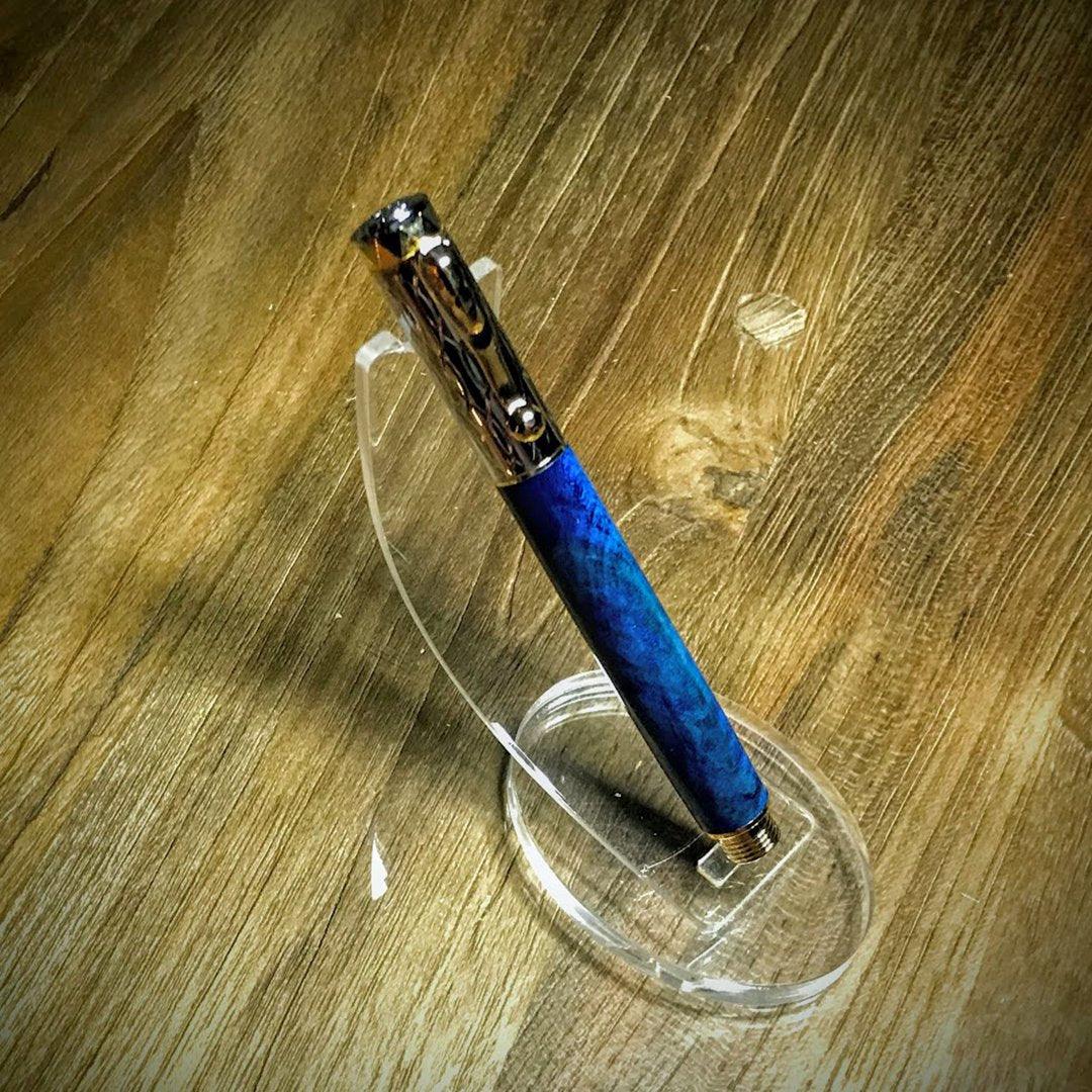 Our pen is crafted with box elder burl, dyed blue and photographed with our Messenger Leather Journal.