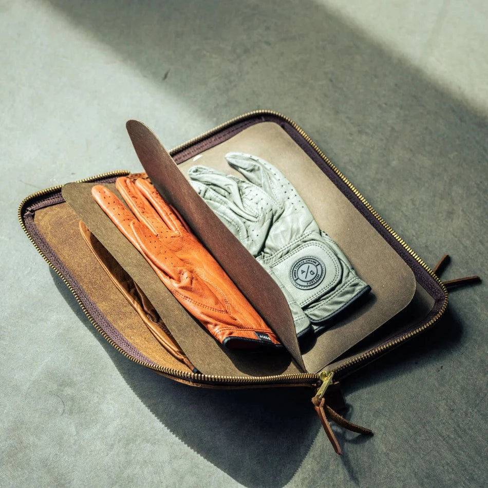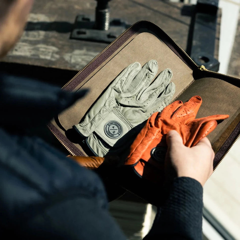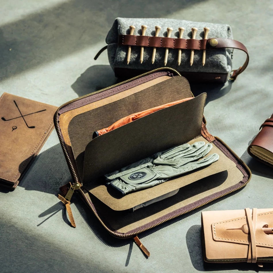 Keep your gloves organized, protected, and in top condition for your next game. Our leather golf glove holder stores gloves of any size with its convenient interior dividers and, with four compartments, there’s space for multiple gloves. Use the exterior zippered pocket to hold small items like ball markers, additionaltees, or a divot tool. With the Golf Glove Caddy, you can be sure you have access to the right glove for any shot.
