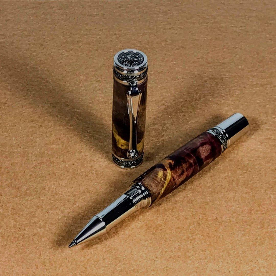 From your desktop to the board room, the Majestic Rollerball lets everyone know you have arrived. This is a large pen, yet balanced and beautiful, handcrafted from big leaf maple burl. The components are Rhodium & Black Ti. Parker Style refills and Display Boxes can be found on our Pen & Accessories Page.